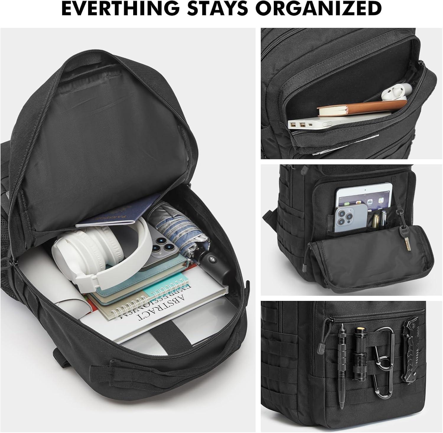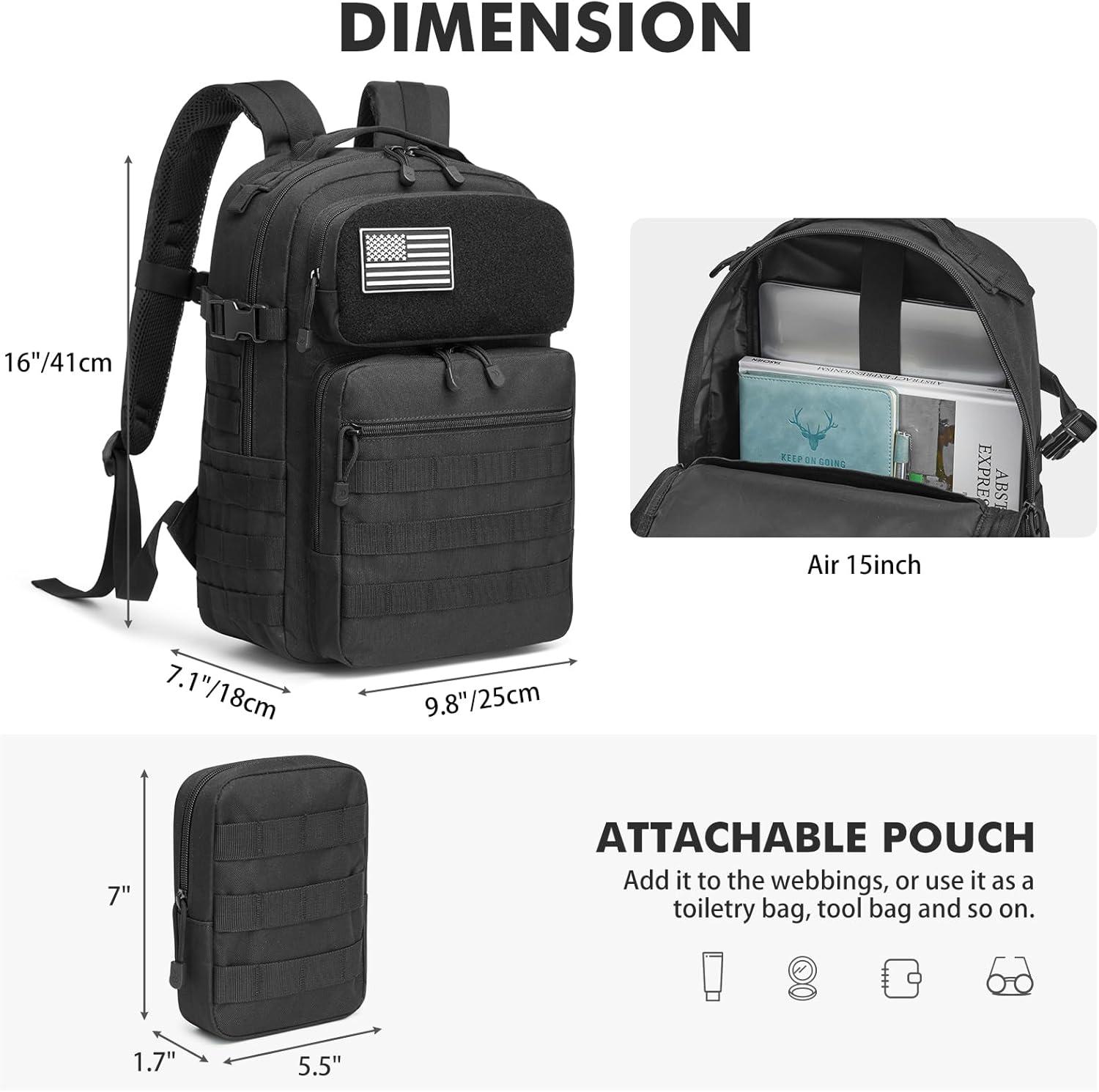 Keep Organized: Multiple compartments and pockets to keep everything organized. Besides, this backpack is designed with an attachable pouch that can be added to the webbings, or use it as a toiletry bag, tool bag and more.
