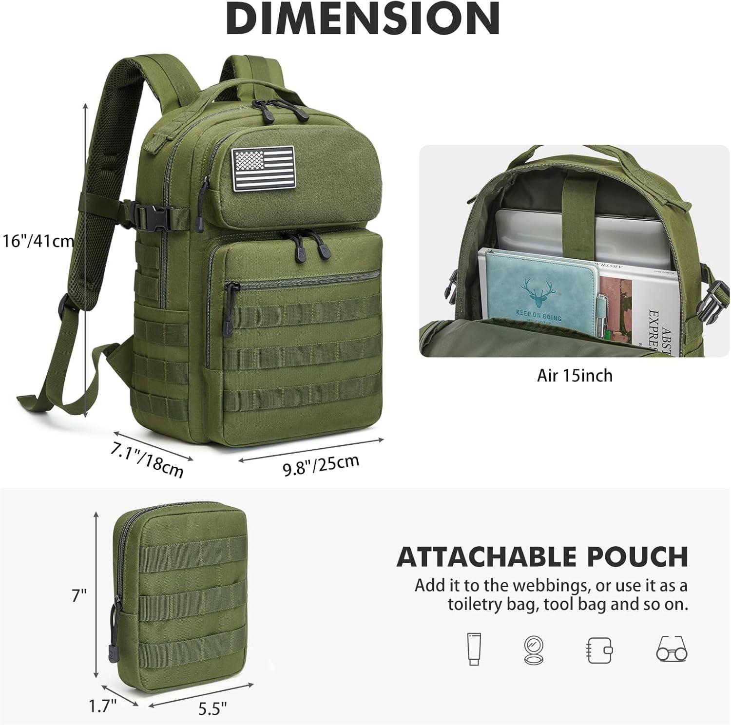 Keep Organized: Multiple compartments and pockets to keep everything organized. Besides, this backpack is designed with an attachable pouch that can be added to the webbings, or use it as a toiletry bag, tool bag and more.