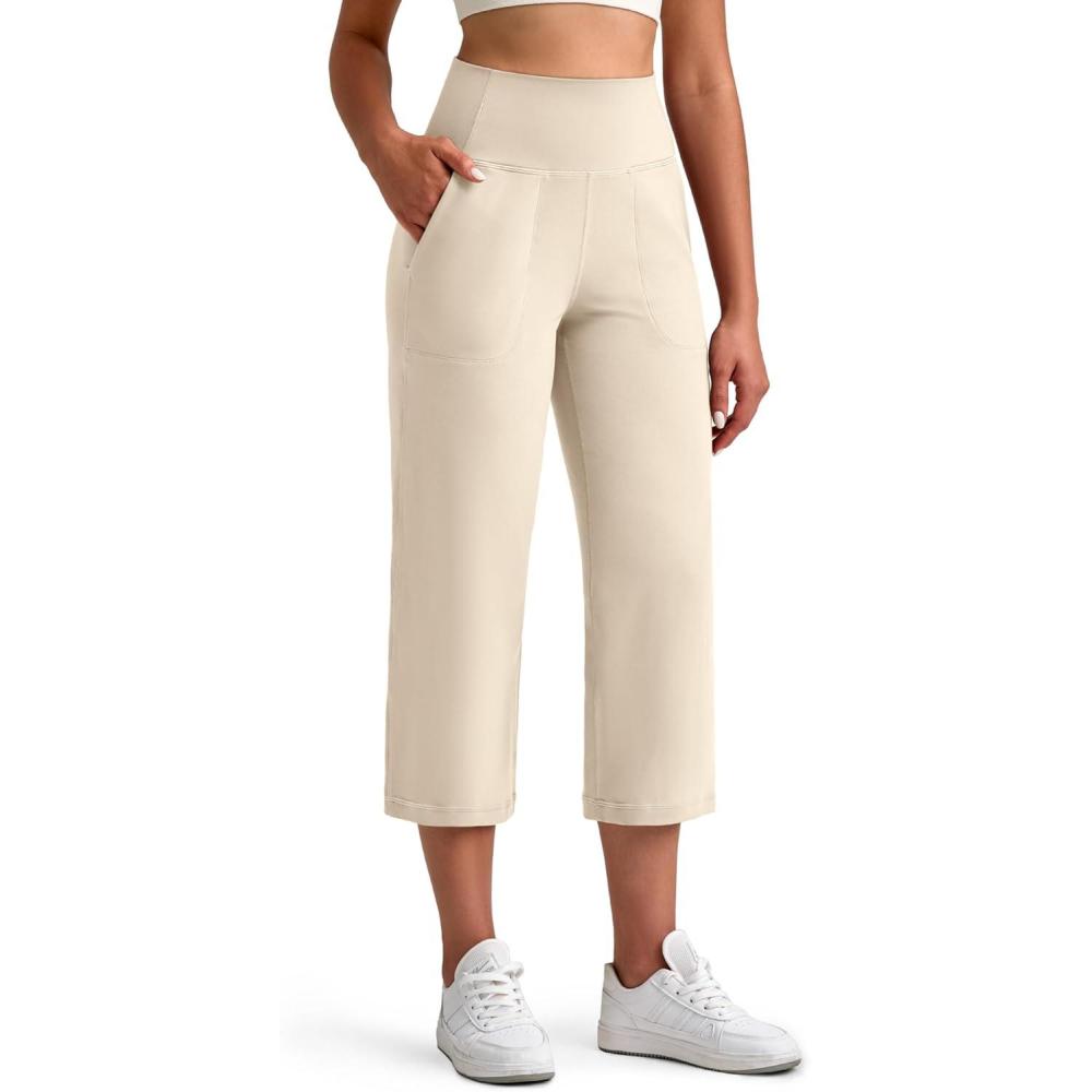 G4Free BareFeel High Stretch Capri Pants for Women Soft Wide Leg Yoga Pants High Waist Casual Capris with Pockets 21″/23″/25″(Light Khaki)