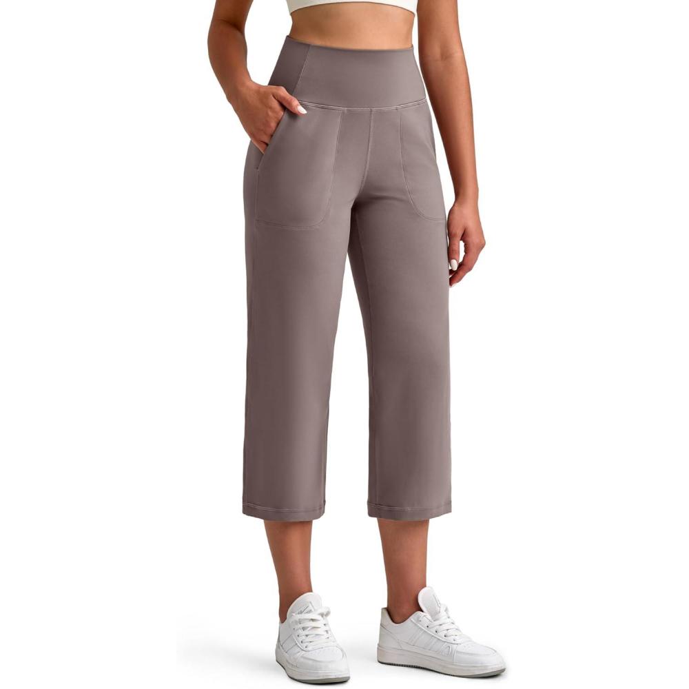G4Free BareFeel High Stretch Capri Pants for Women Soft Wide Leg Yoga Pants High Waist Casual Capris with Pockets 21"/23"/25"(Taupe)
