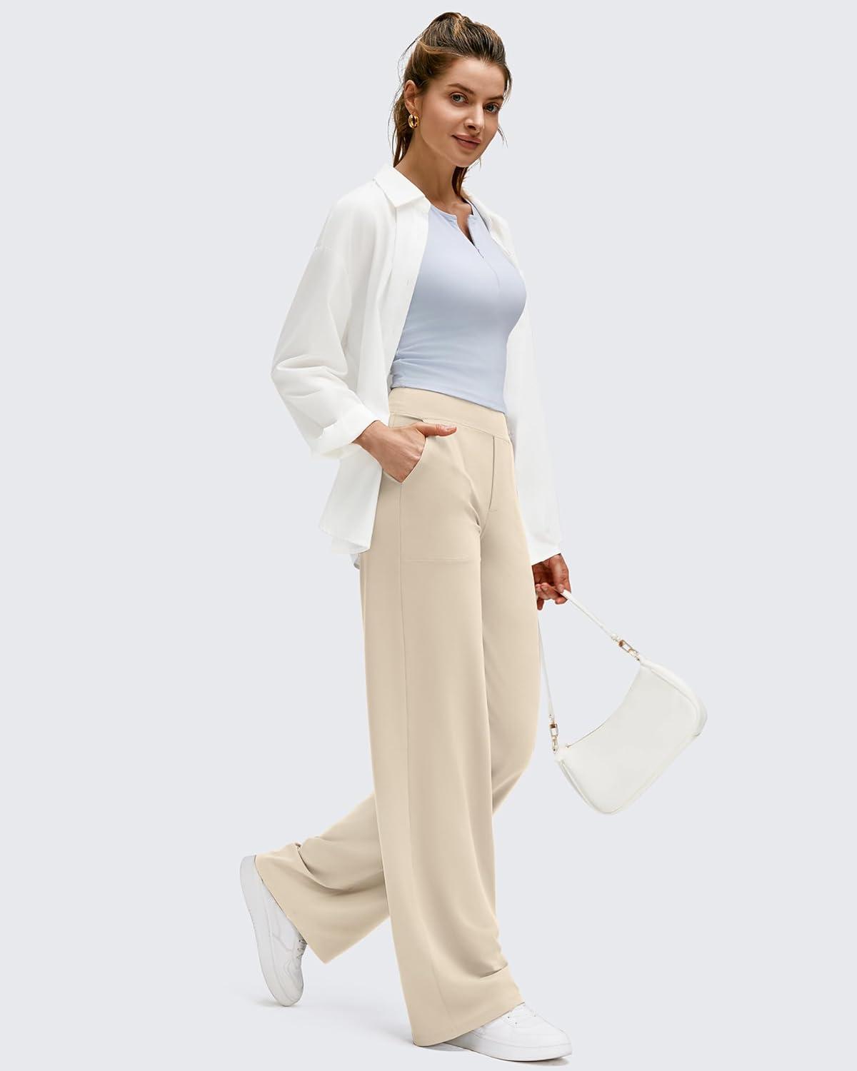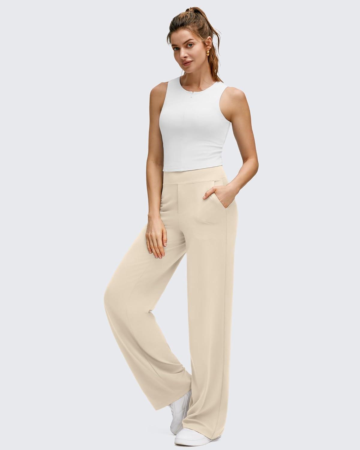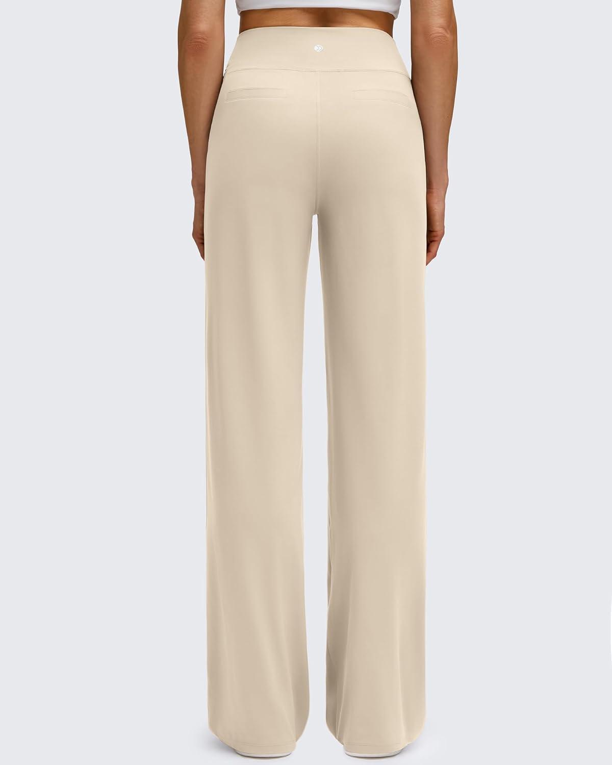G4Free BareFeel High Stretch Wide Leg Pants for Women Soft Comfy Casual Yoga Pants with Pockets Petite/Regular/Tall(Light Khaki)