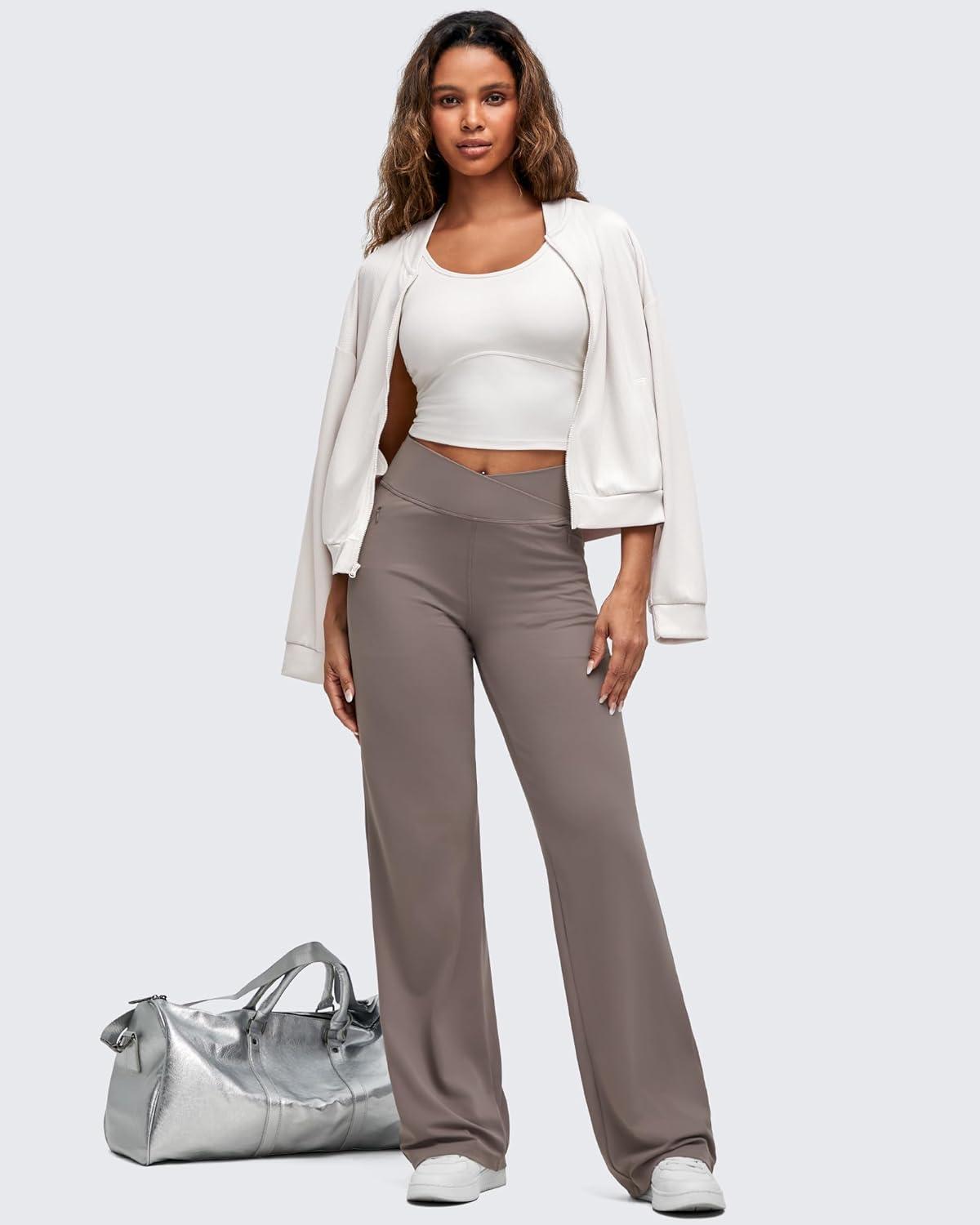 G4Free BareFeel High Stretch Women Wide Leg Yoga Pants Cross Waist Casual Trousers with Zipper Pockets 29″/31″/33″(Taupe)