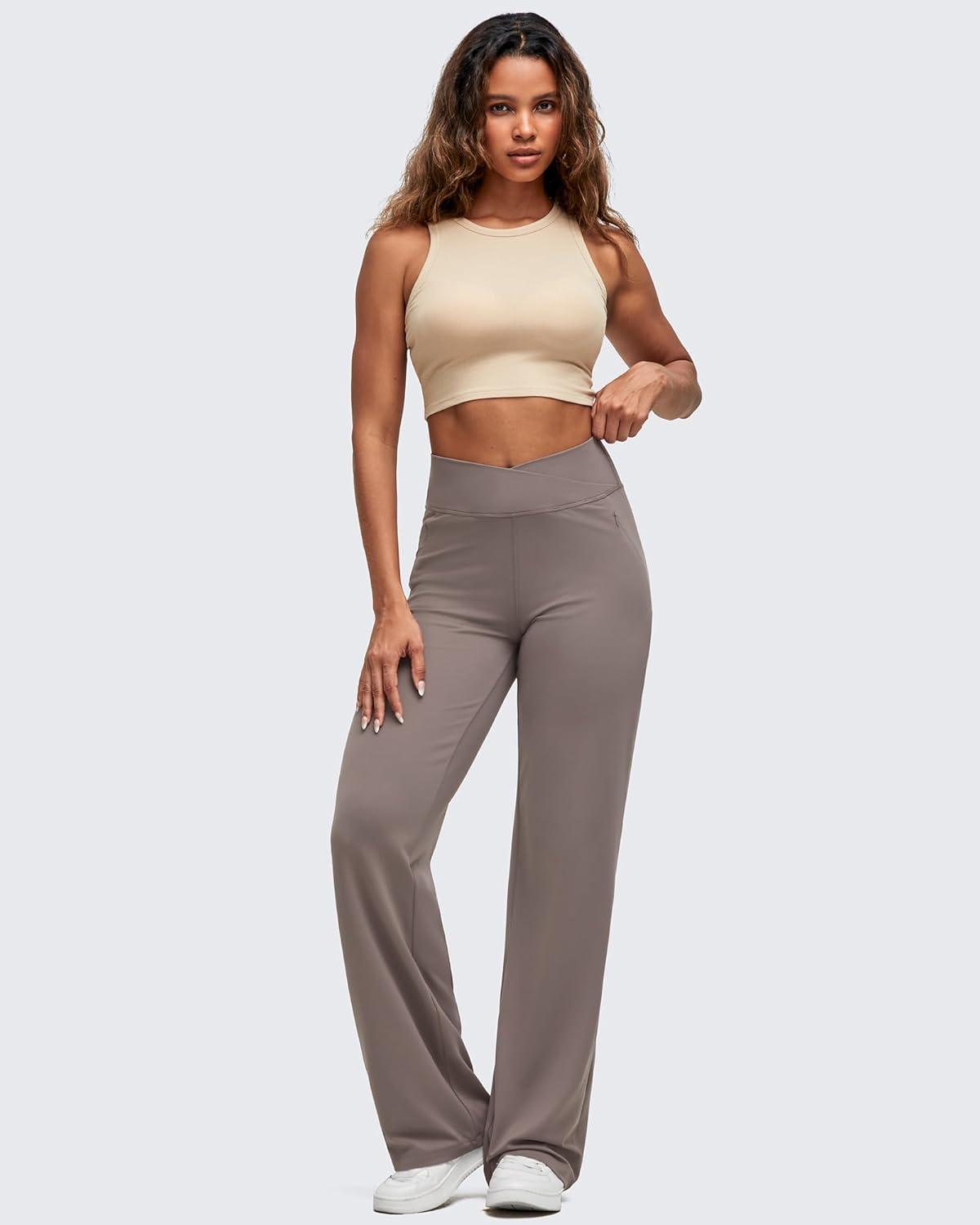 imageG4Free BareFeel High Stretch Women Wide Leg Yoga Pants Cross Waist Casual Trousers with Zipper Pockets 29quot31quot33quotTaupe