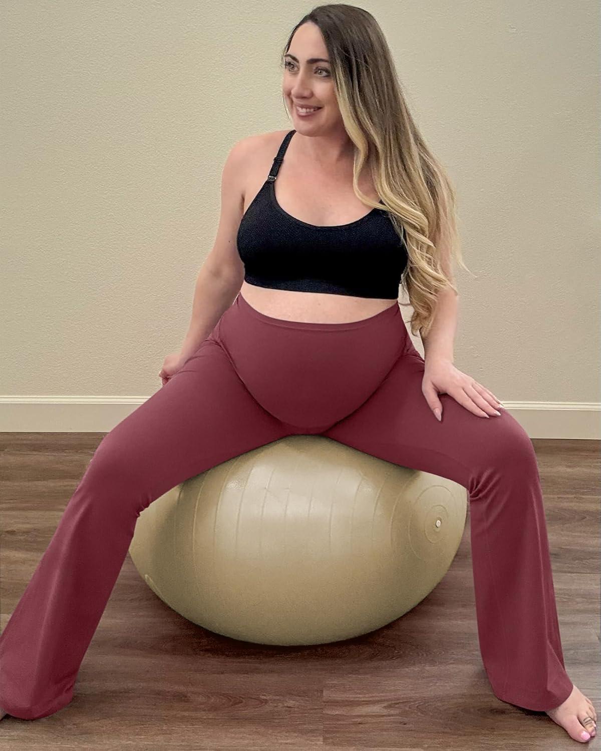 imageG4Free BareFeel Maternity Flare Leggings with Pockets Over The Belly Stretchy Casual Lounge Pregnancy Dress Pants for WorkDark Burgundy