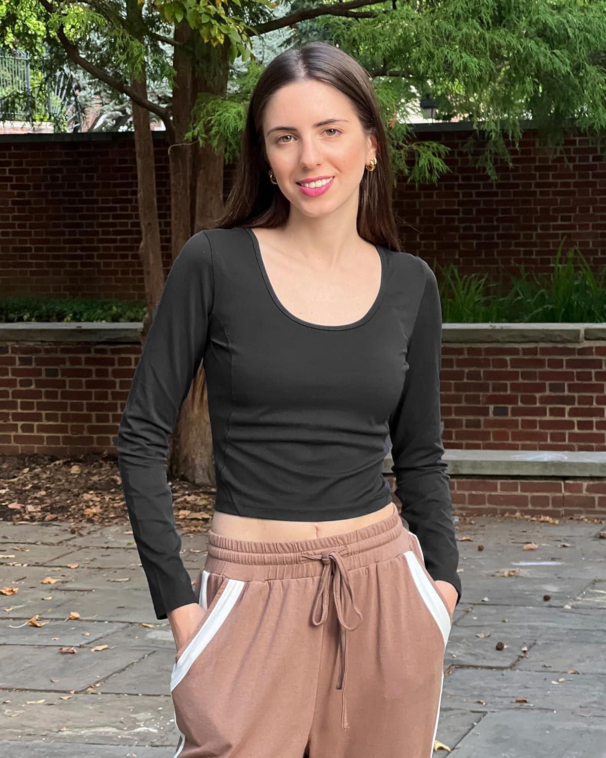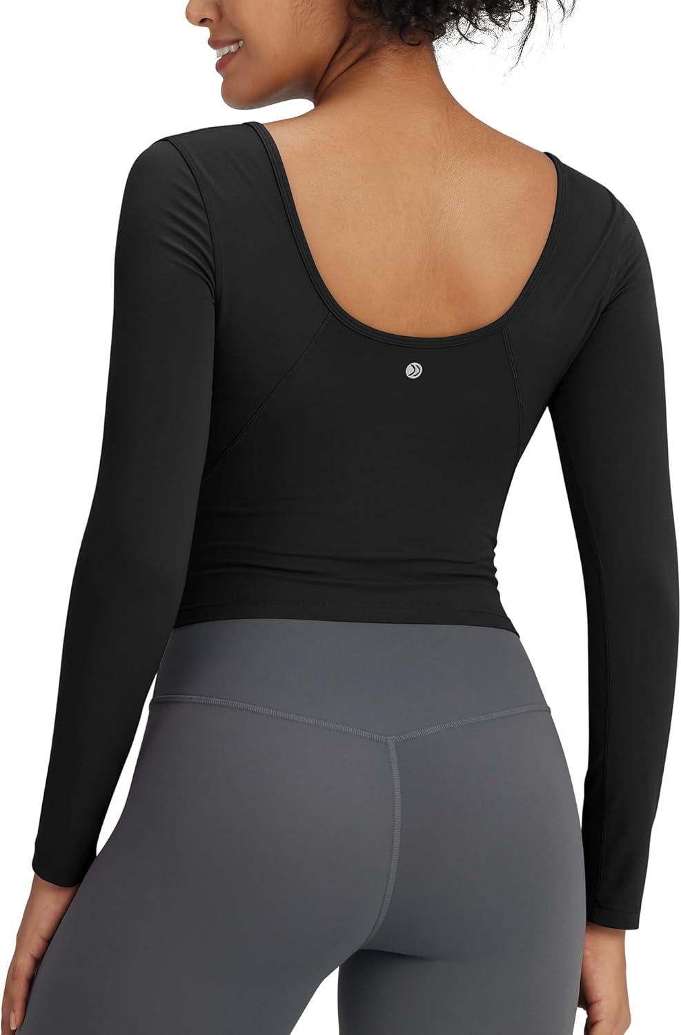 G4Free Barefeel Slim Fitted Womens Long Sleeve Crop Workout Tops Low Back Athletic Yoga Exercise Shirts Scoop Neck Base Layer(Black)
