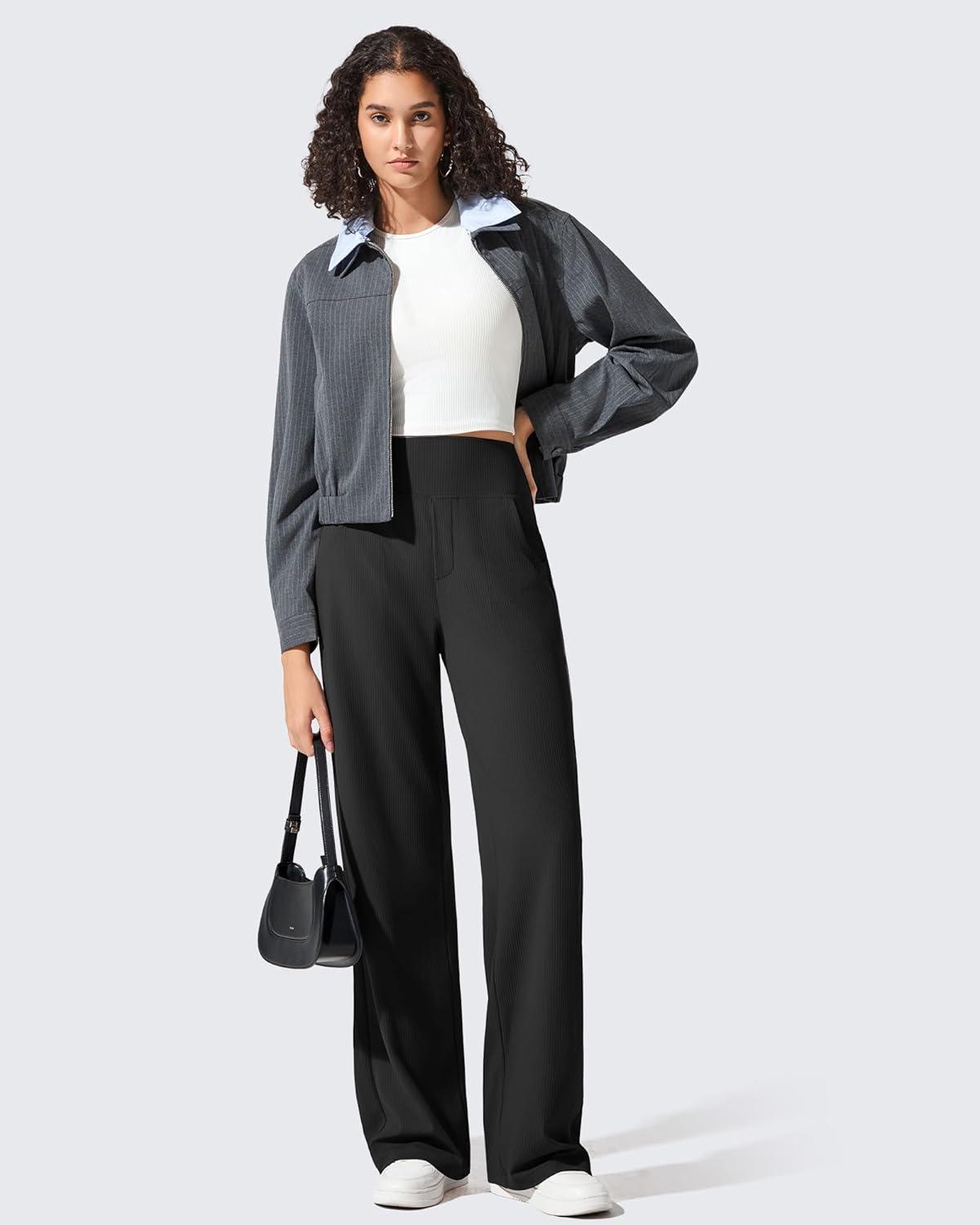 G4Free Breathable Ribbed Wide Leg Yoga Pants Women High Waist Lightweight Casual Trousers with Pockets(Black)