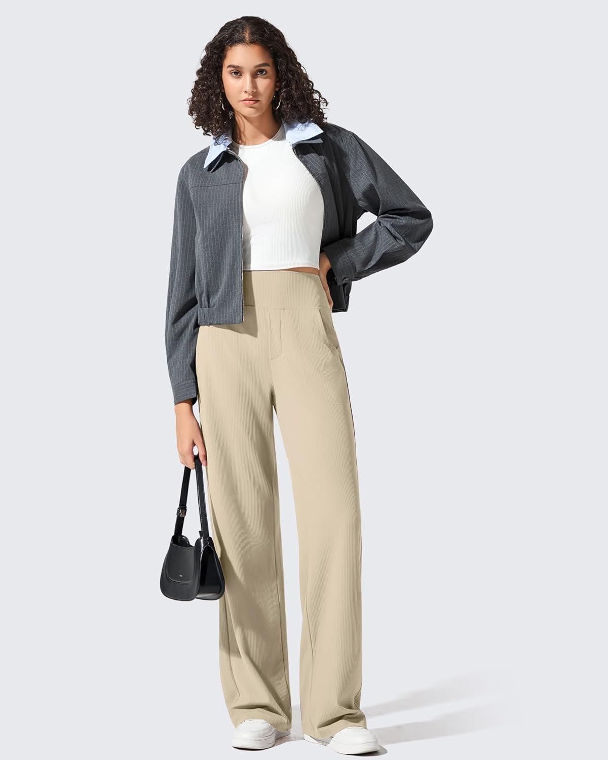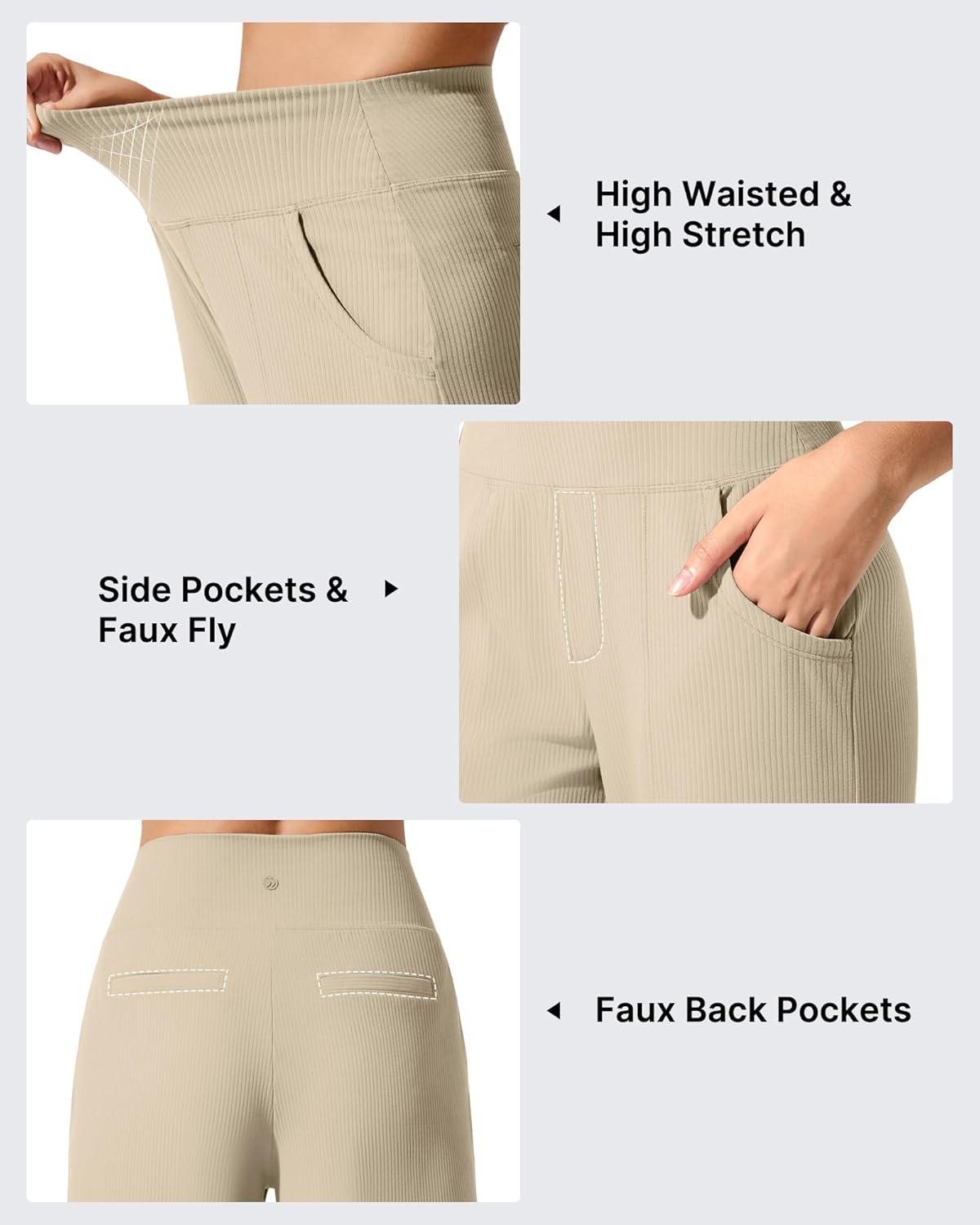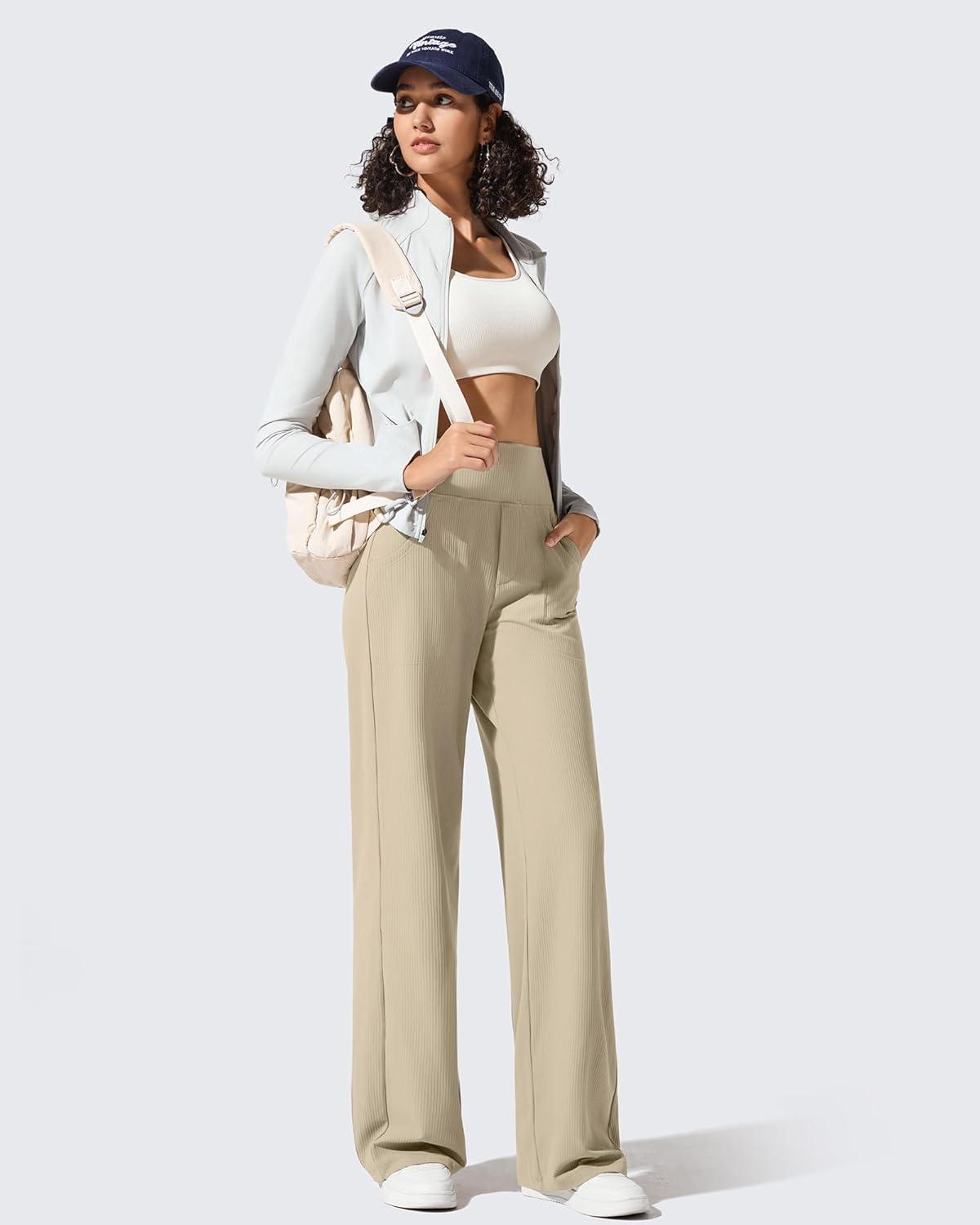 G4Free Breathable Ribbed Wide Leg Yoga Pants Women High Waist Lightweight Casual Trousers with Pockets(Dirty Latte)