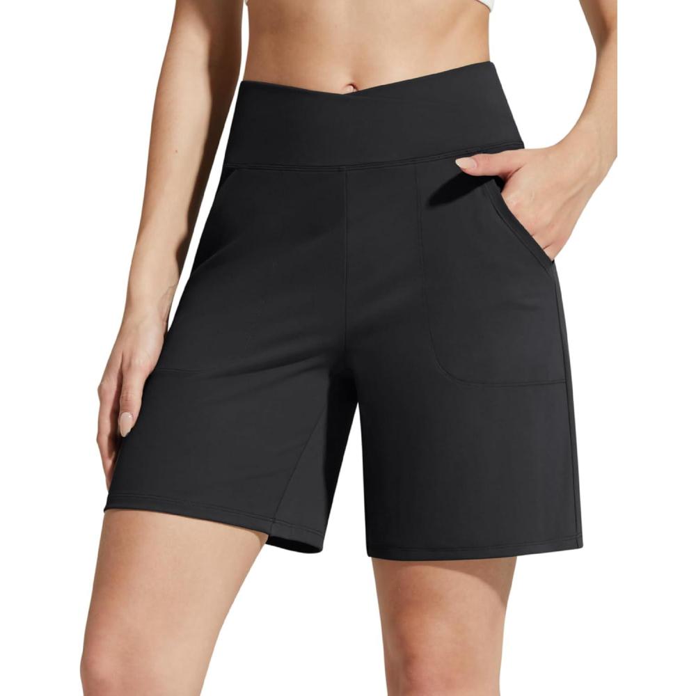 G4Free EverGoing Athletic Shorts for Women 6″ Cross Waist Summer Casual Shorts with Pockets(Black)