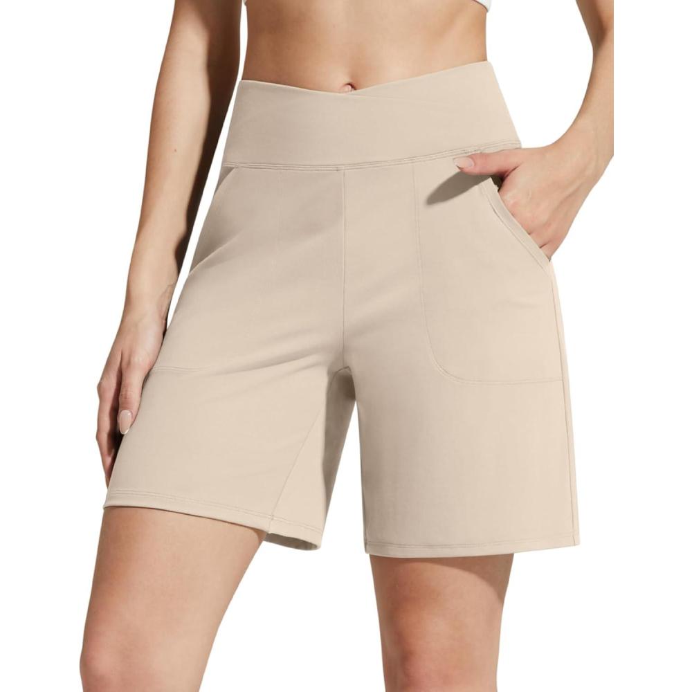 G4Free EverGoing Athletic Shorts for Women 6″ Cross Waist Summer Casual Shorts with Pockets(Light Khaki)