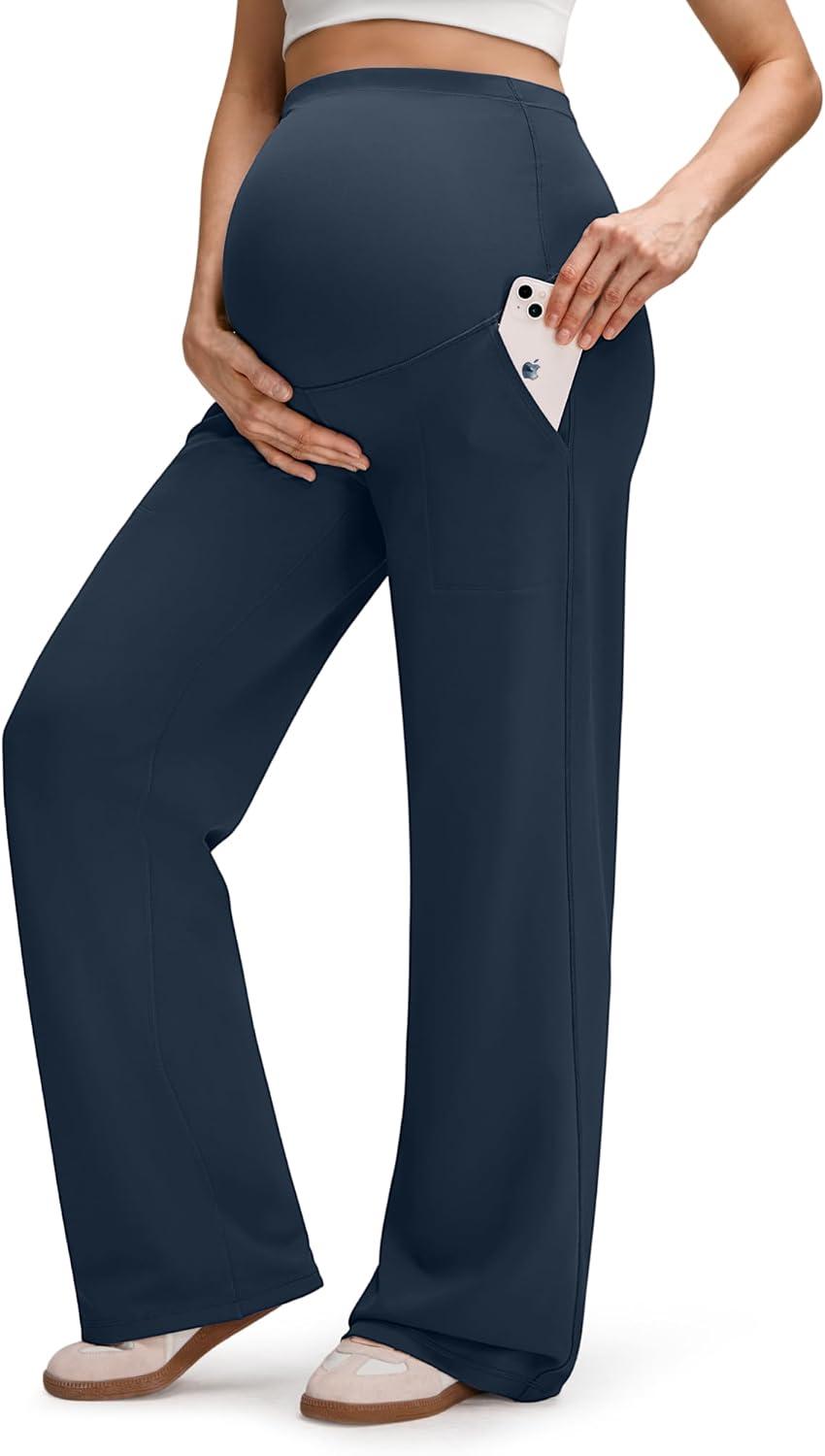 G4Free EverGoing Fleece Lined Maternity Wide Leg Pants Over The Belly Pregnancy Trousers with Pockets(Dark Blue)