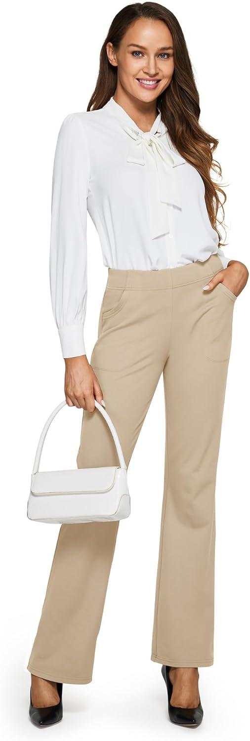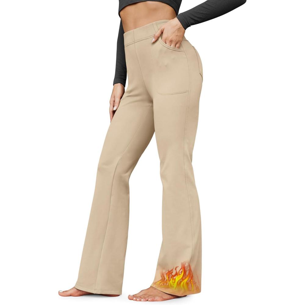 G4Free Fleece Lined Pants for Women Yoga Pants with Pockets Flare Leggings High Waisted Bootcut Dress Winter Work Slacks(Light Khaki)