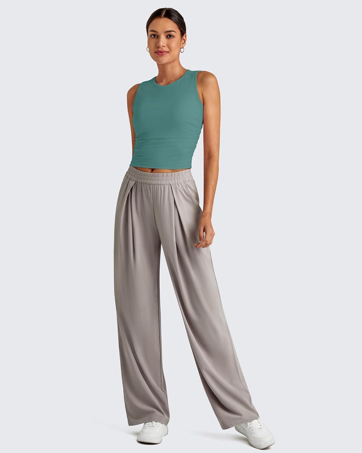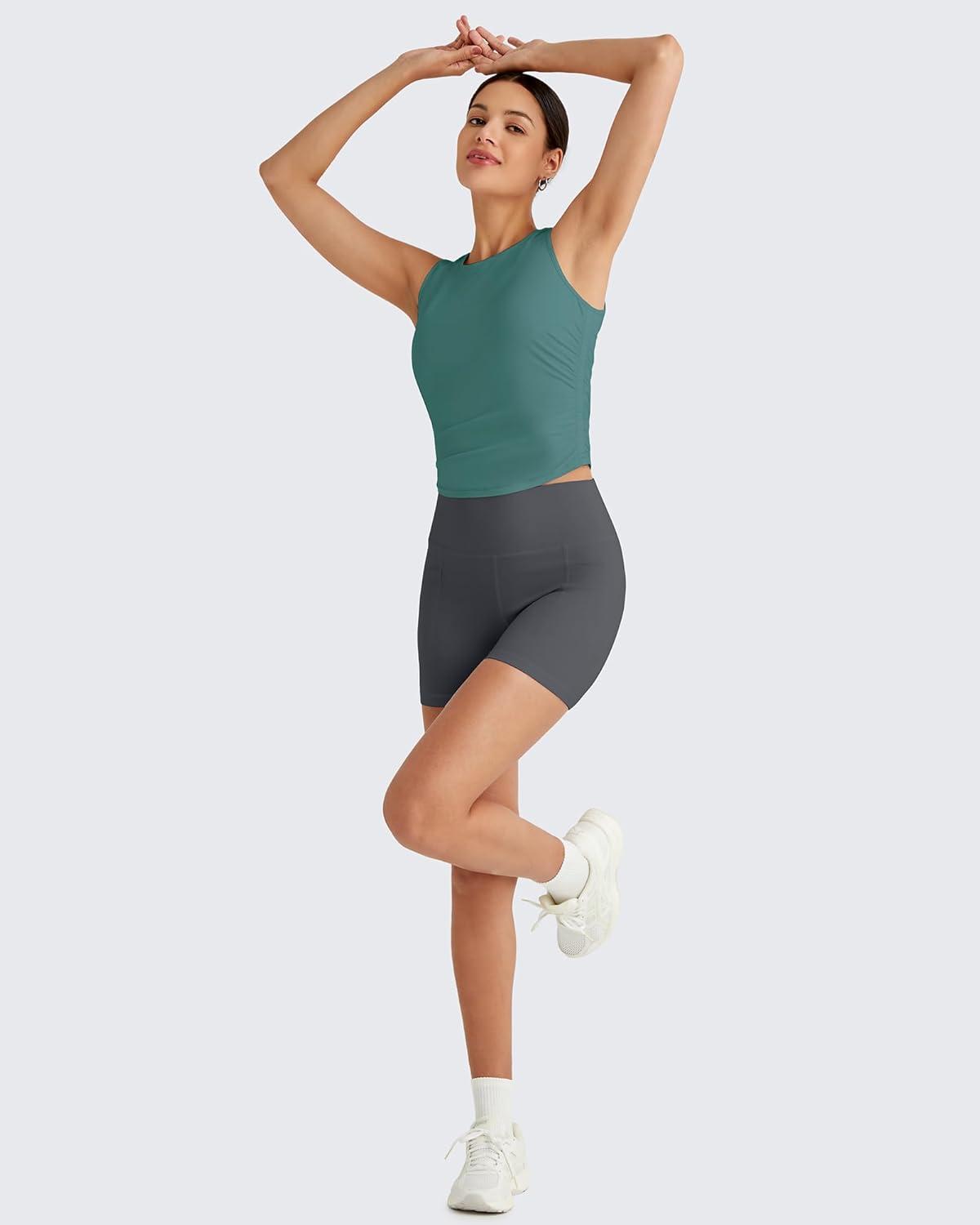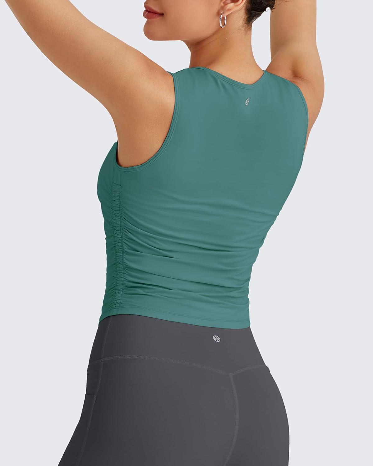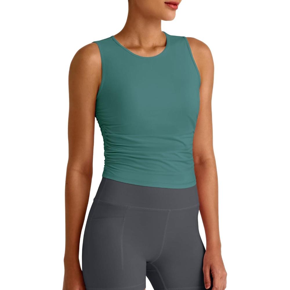 G4Free Lightbreeze Workout Tank Tops for Women Side Ruched Sleeveless High Neck Crop Top Summer Athletic Gym Shirts(Myrtle Green)