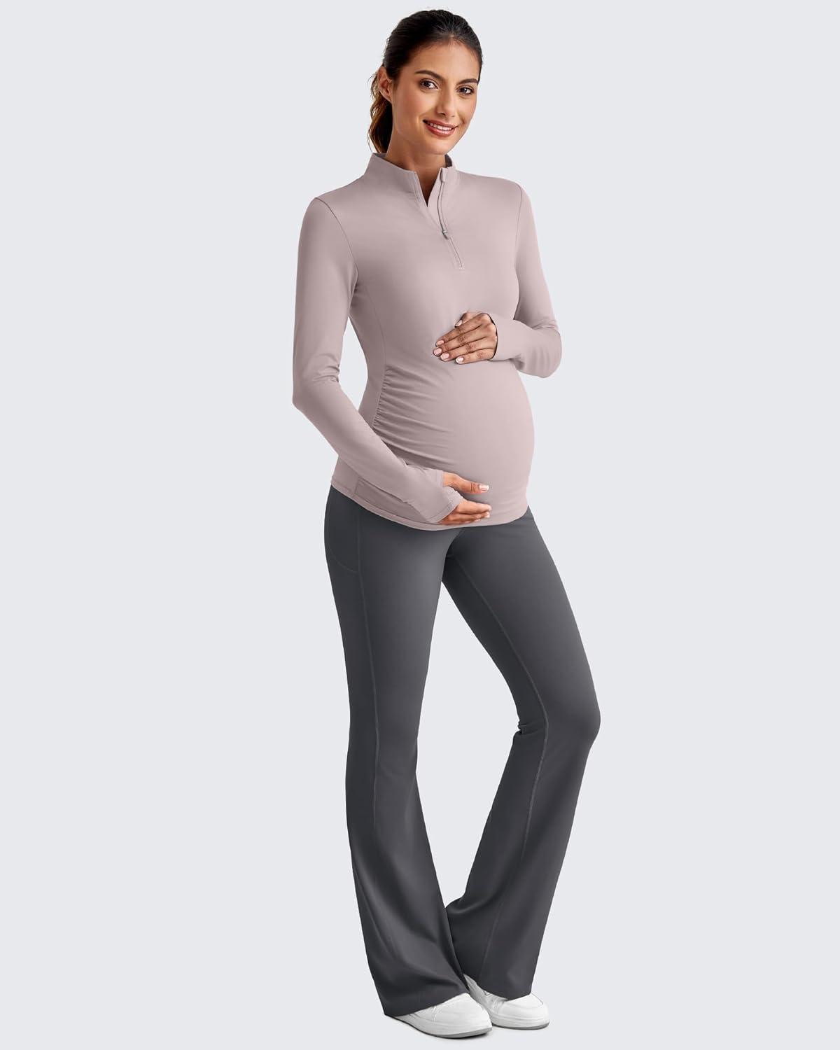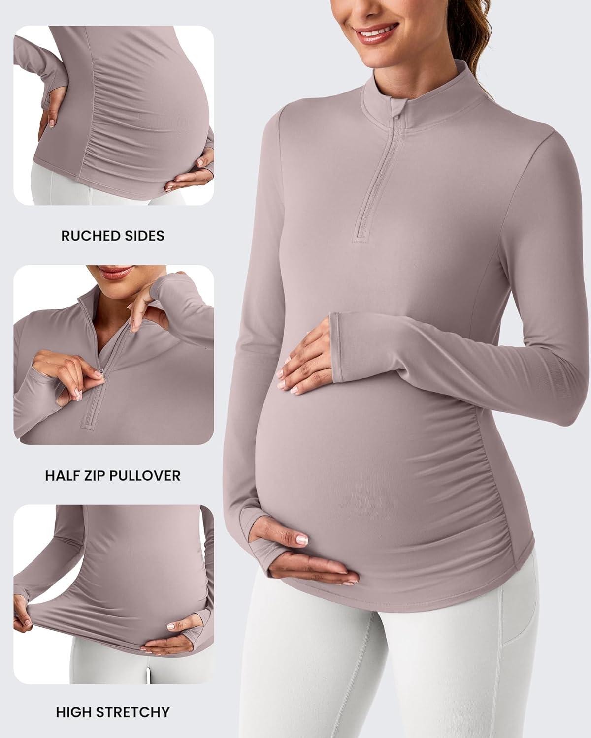 imageG4Free Lightweight Maternity Long Sleeve Workout Tops UPF 50 Rash Guard Half Zip Sun Shirts Ruches Pregnancy PulloverSmoky Blush