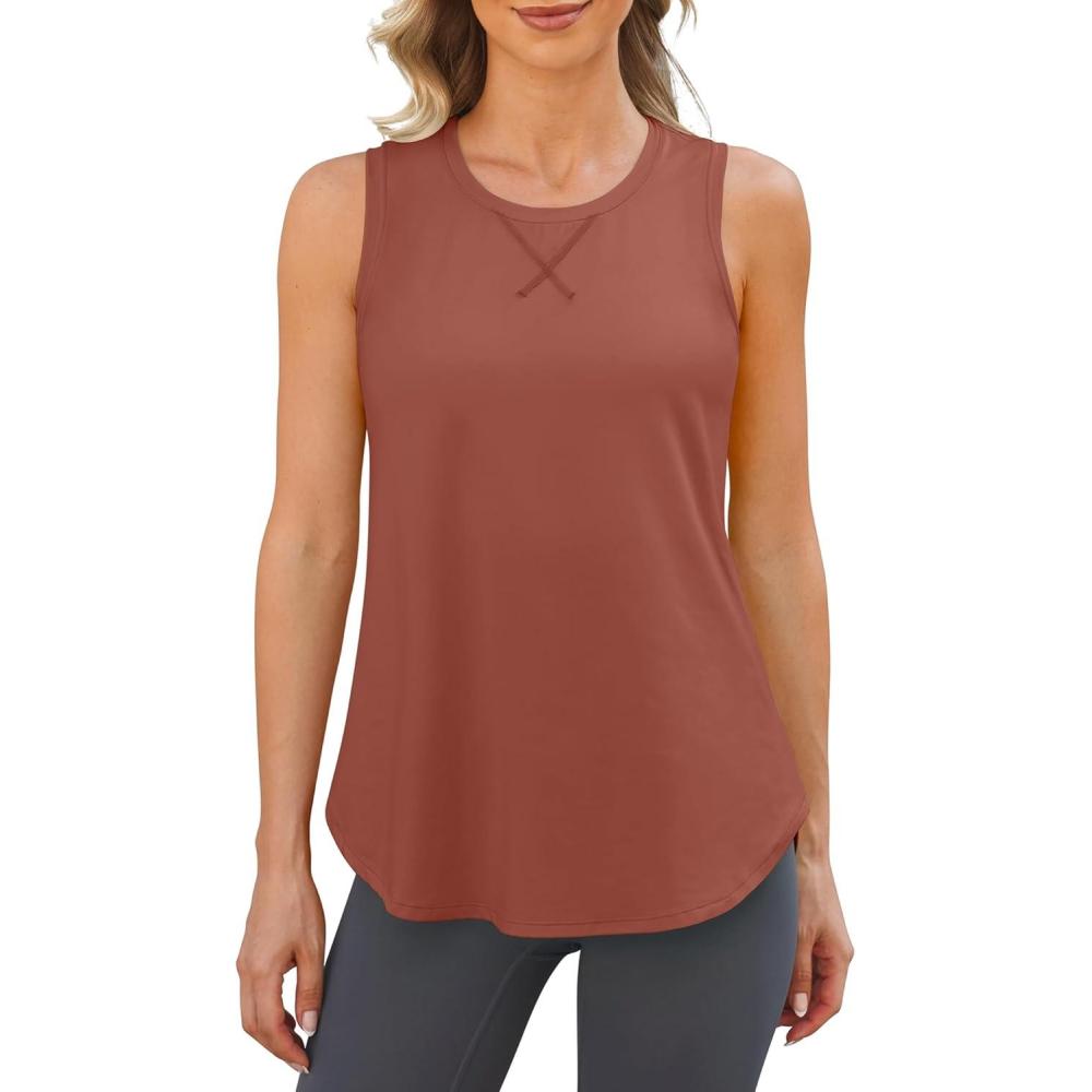 imageG4Free Racerback Workout Tank Tops for Women High Neck Athletic Long Tanks Fast Dry Sleeveless Pilates Running ShirtsBrown