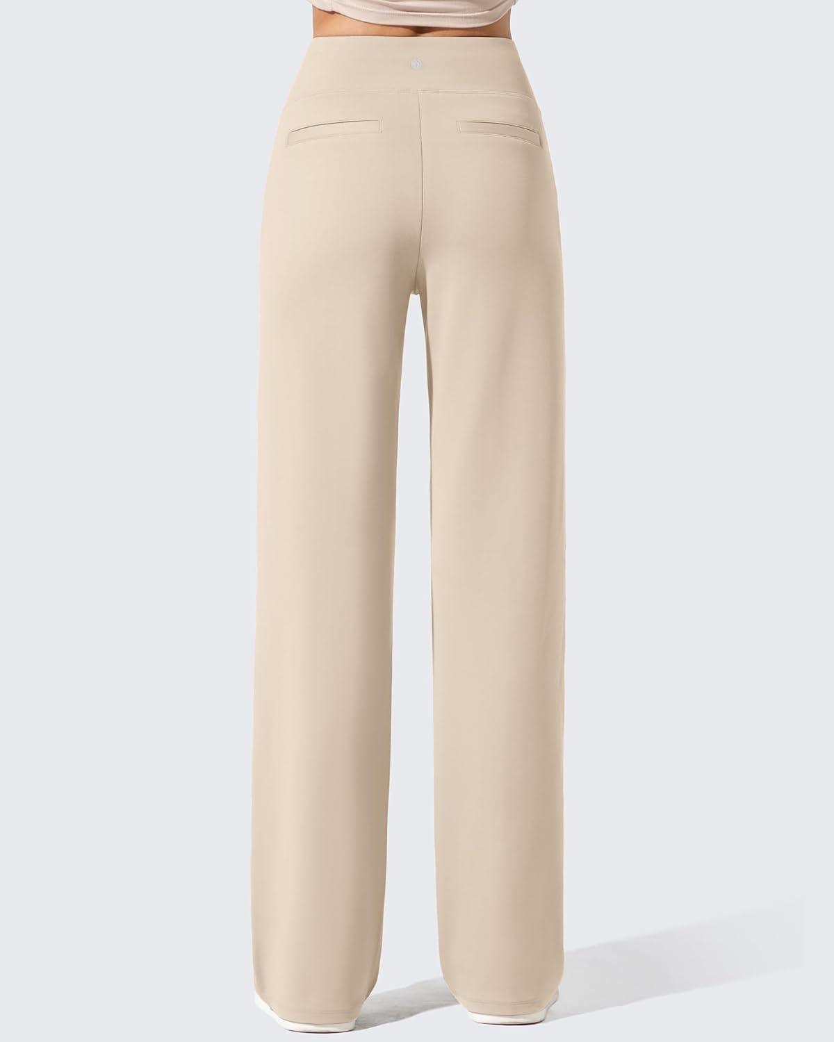G4Free Women Fleece Lined Pants with Pockets Wide Leg Winter Thermal Work Trousers Dressy Casual Petite/Regular/Tall(Light Khaki)