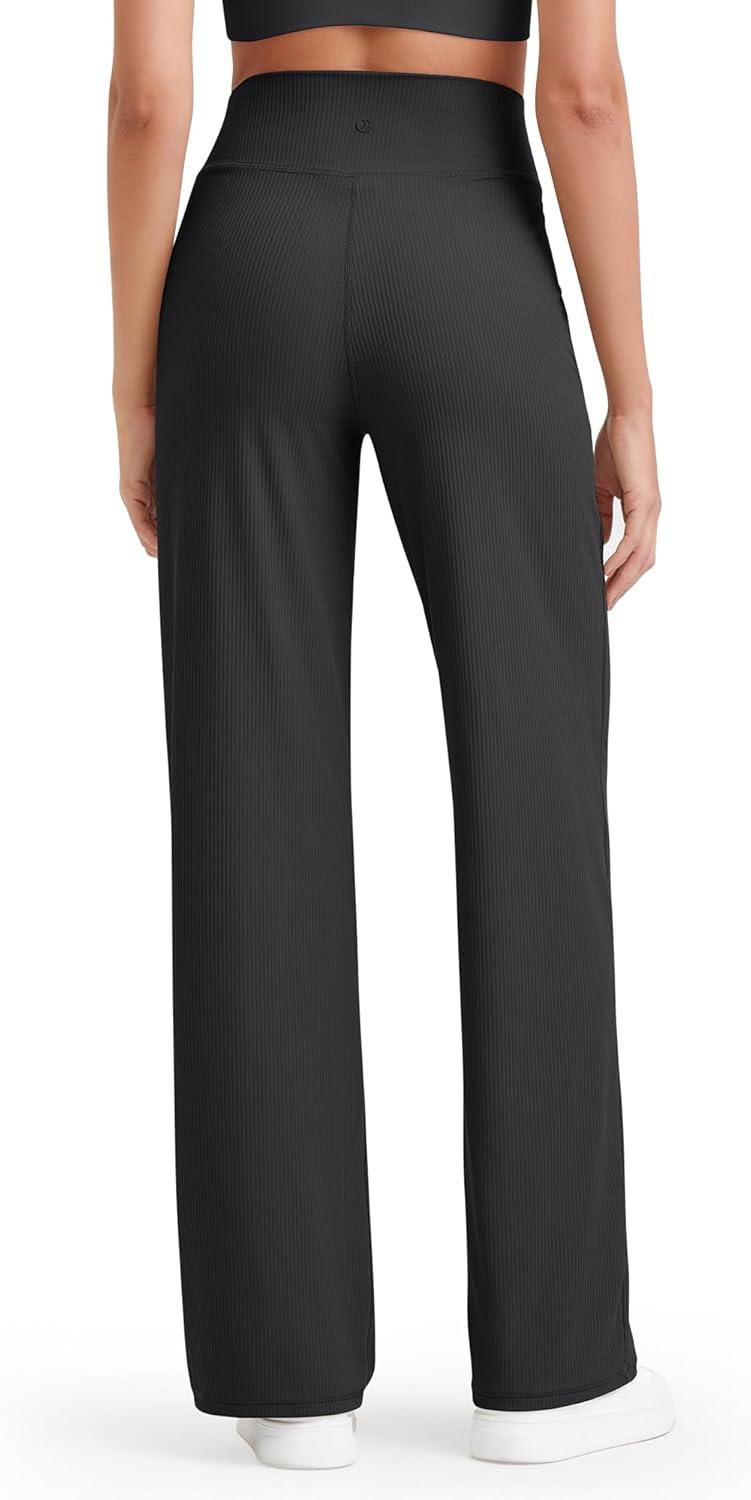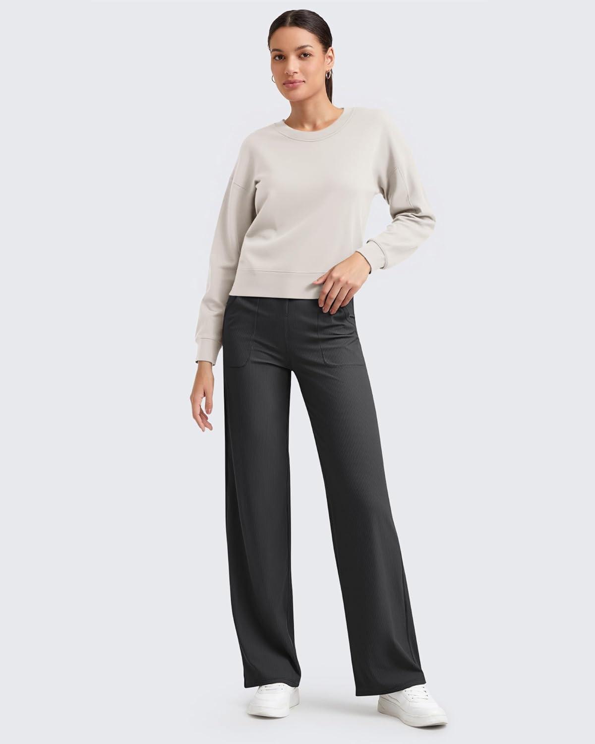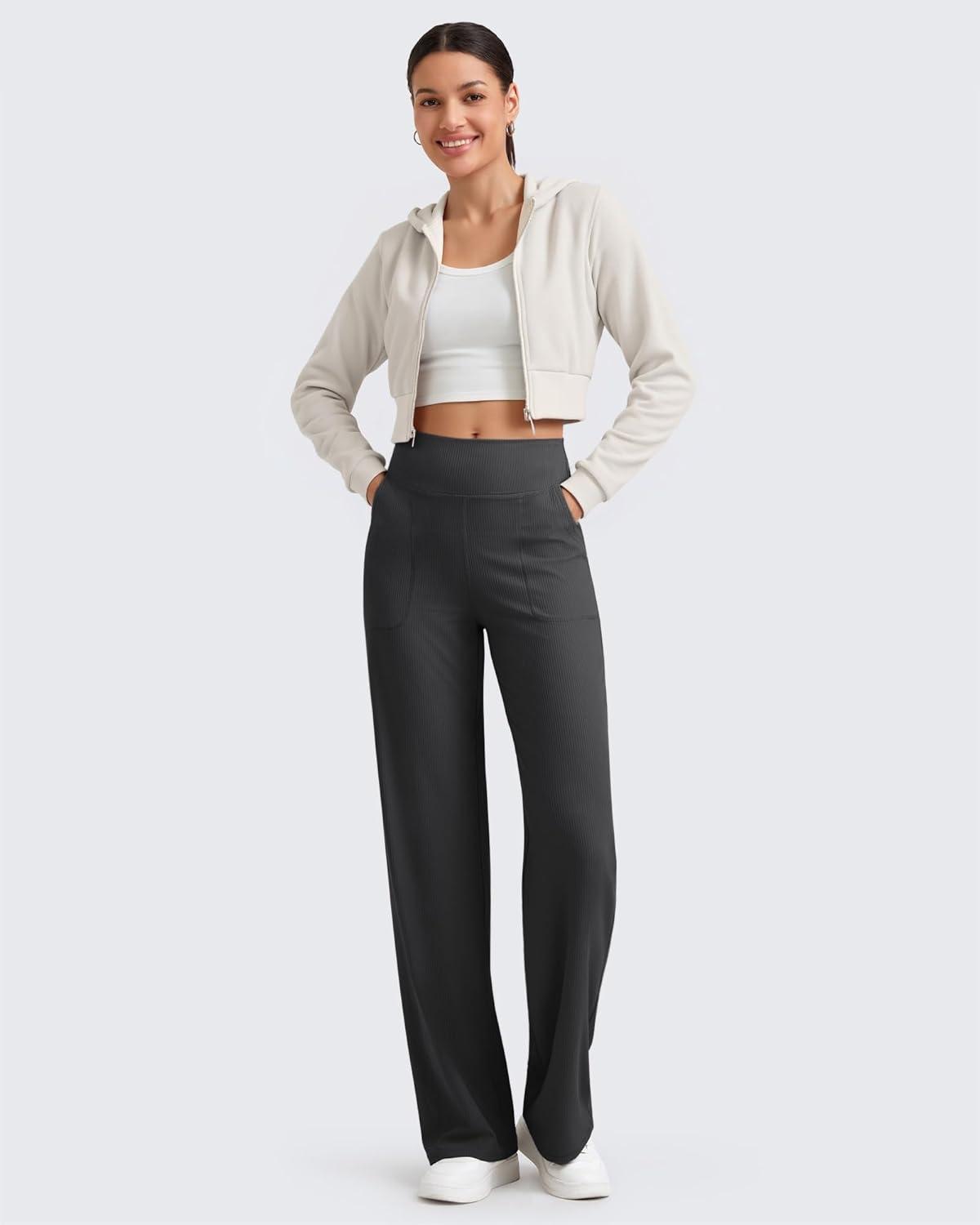 G4Free Womne’s Ribbed Knit Wide Leg Pants with Pockets Lightweight Stretchy Yoga Pants Casual Lounge(Black)